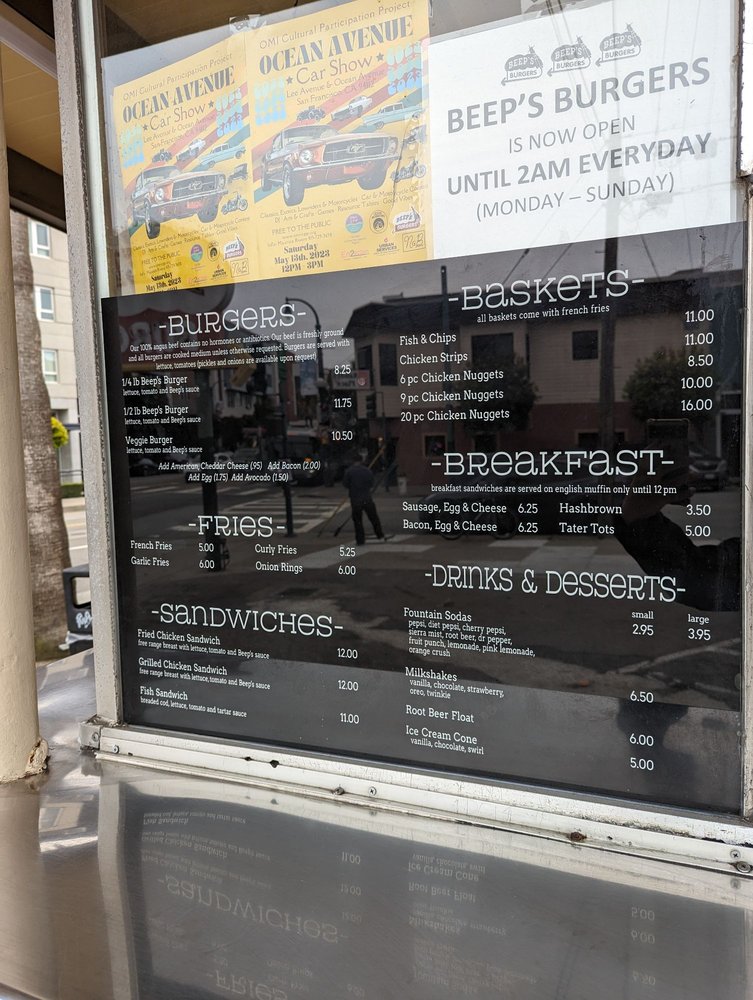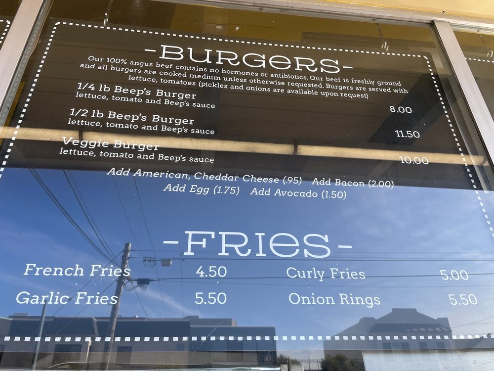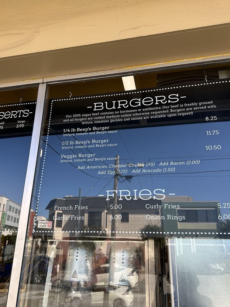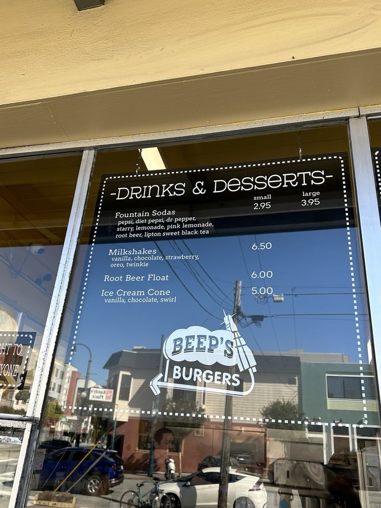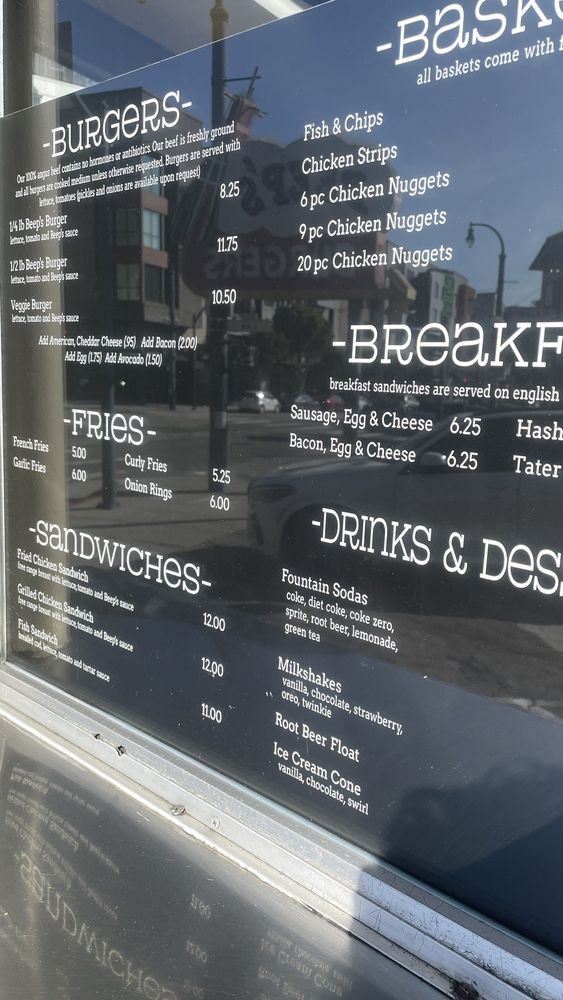 Introducing Beep's Burgers, a classic burger joint in San Francisco known for its iconic drive-in experience and exceptional menu. Located at 1051 Ocean Ave, Beep's Burgers offers a variety of options, including vegan and vegetarian choices, catering to a diverse array of tastes. The 1/4 lb Beep's Burger with cheddar cheese is a standout item, made from 100% Angus beef and served with fresh toppings in a soft bun. Pair it with their perfectly seasoned curly fries and a rich milkshake for a satisfying meal.